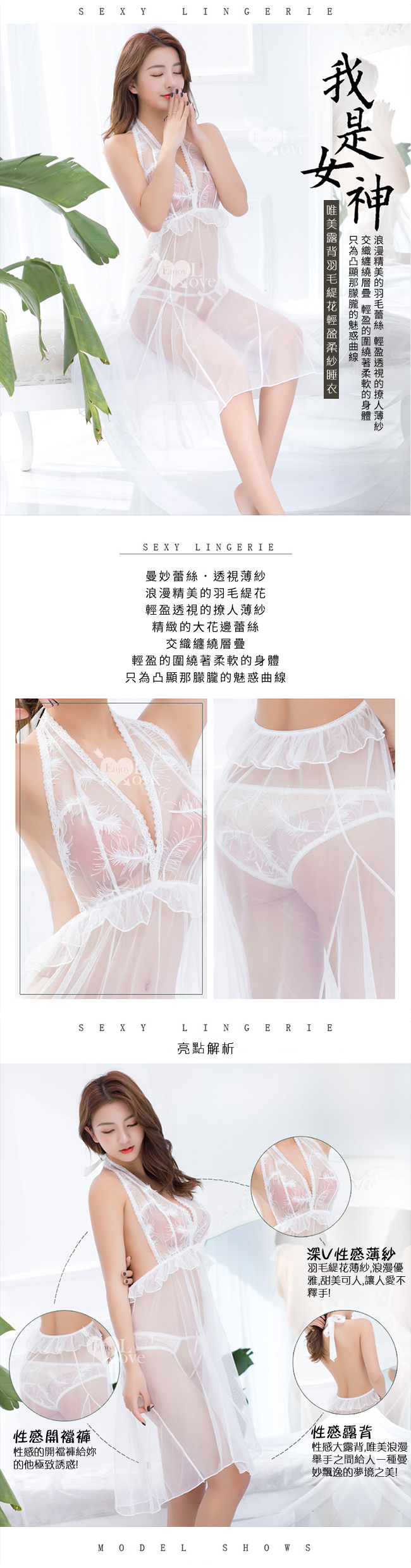 純情氣息!唯美露背羽毛緹花輕盈柔紗睡衣