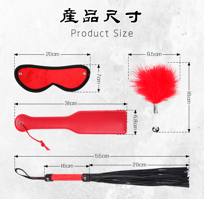 【SM調教】調教散鞭/戲謔手拍/酥癢羽毛棒/調情眼罩 4件套組﹝紅﹞