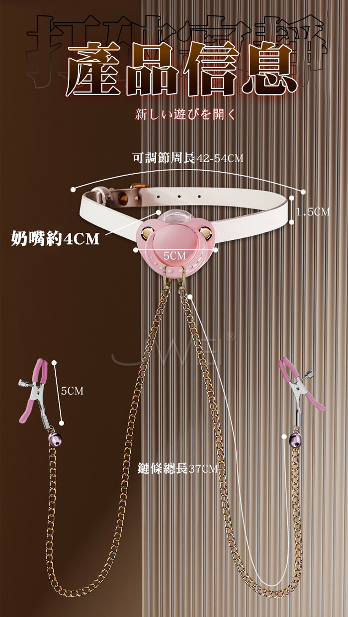 情侶玩具 羞恥調教 奶嘴口塞乳夾 口水流垂 奶嘴設計矽膠材質的奶嘴Q彈耐用軟萌可愛 乳夾鈴鐺隨著身體擺動而循序漸進,乳此動聽 產品規格 ■尺寸:大小詳如圖片標示 ■材質:皮革+合金+矽奶嘴 ■特色:增進情趣 ■SM用品屬於特殊情趣用品,需在雙方清醒自願的情況下使用,該物品僅作為情趣用品使用,使用時應注意安全!!