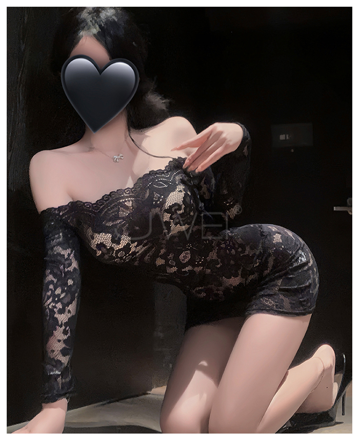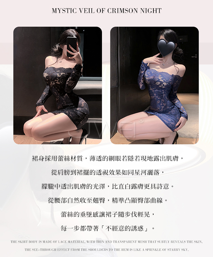 ►您現在的位置:首頁>花蔓朦朧.蕾絲雕花一字領透視包臀睡裙【連身裙+T褲+隱形肩帶-藍色】