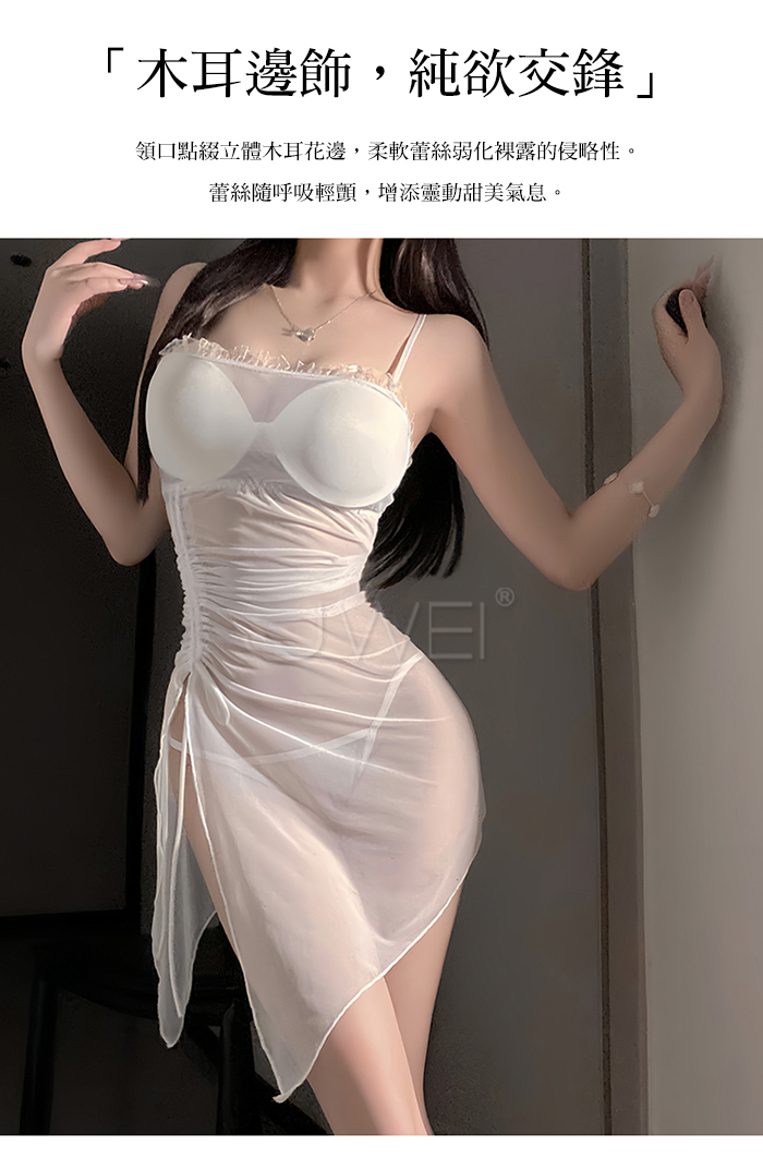 夜紗迷境.韻味透紗木耳邊飾側開衩抽褶收腰睡裙【睡裙+T褲-白色】