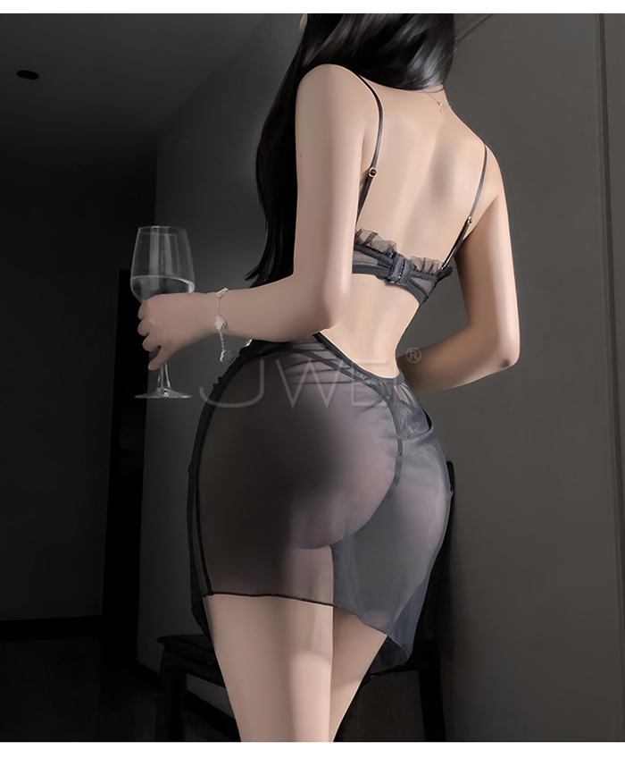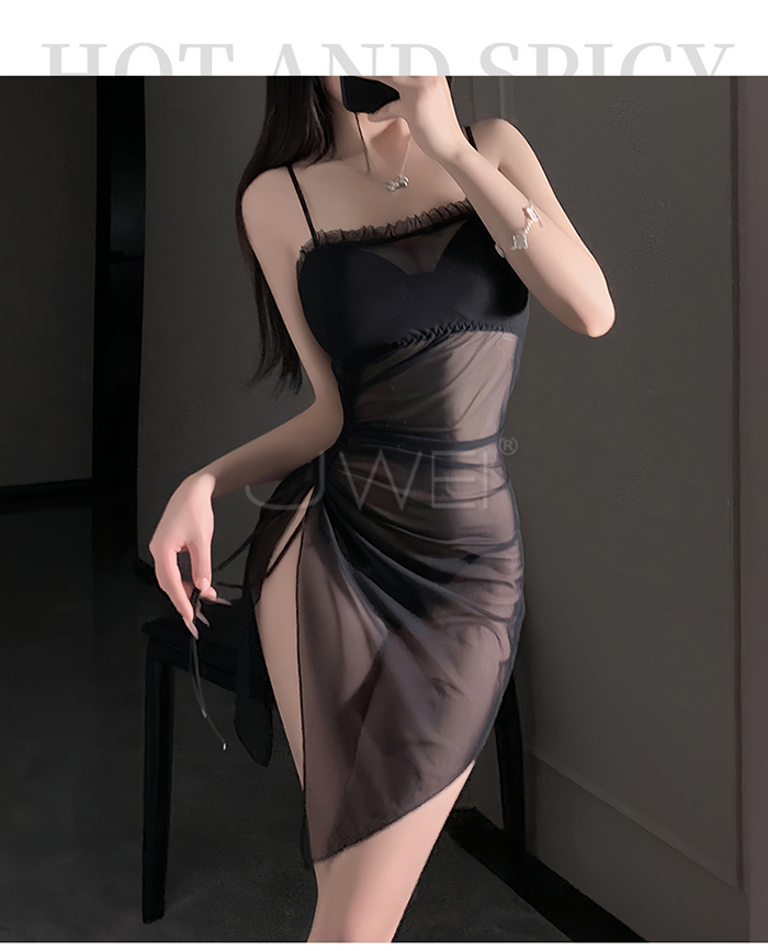►您現在的位置:首頁>夜紗迷境.韻味透紗木耳邊飾側開衩抽褶收腰睡裙【睡裙+T褲-白色】