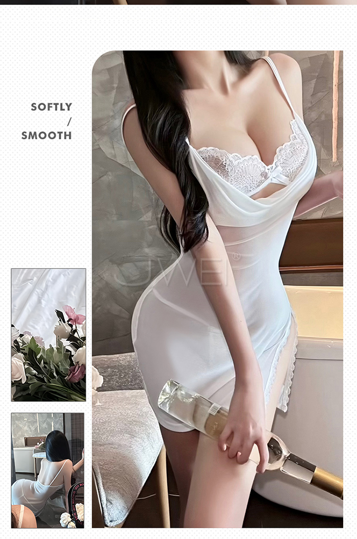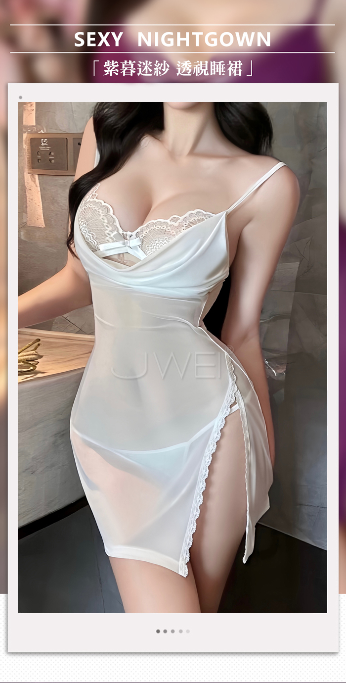月暮迷紗.性感裸紗蕩領透視側開衩細肩帶美背睡裙【睡裙+T褲-白色】