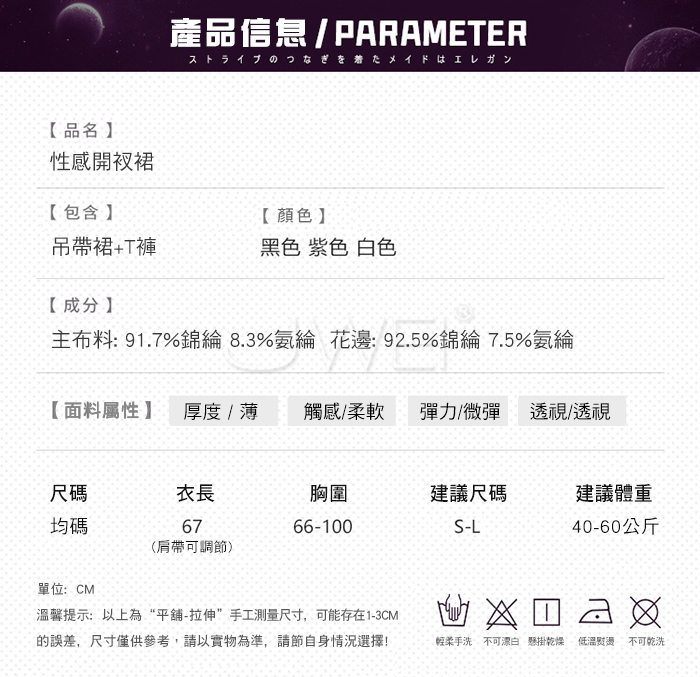 2.基於保障消費者個人衛生,情趣衣物類恕不接受退換貨,如為商品本身暇疵,接受三日內換貨,請勿試穿。