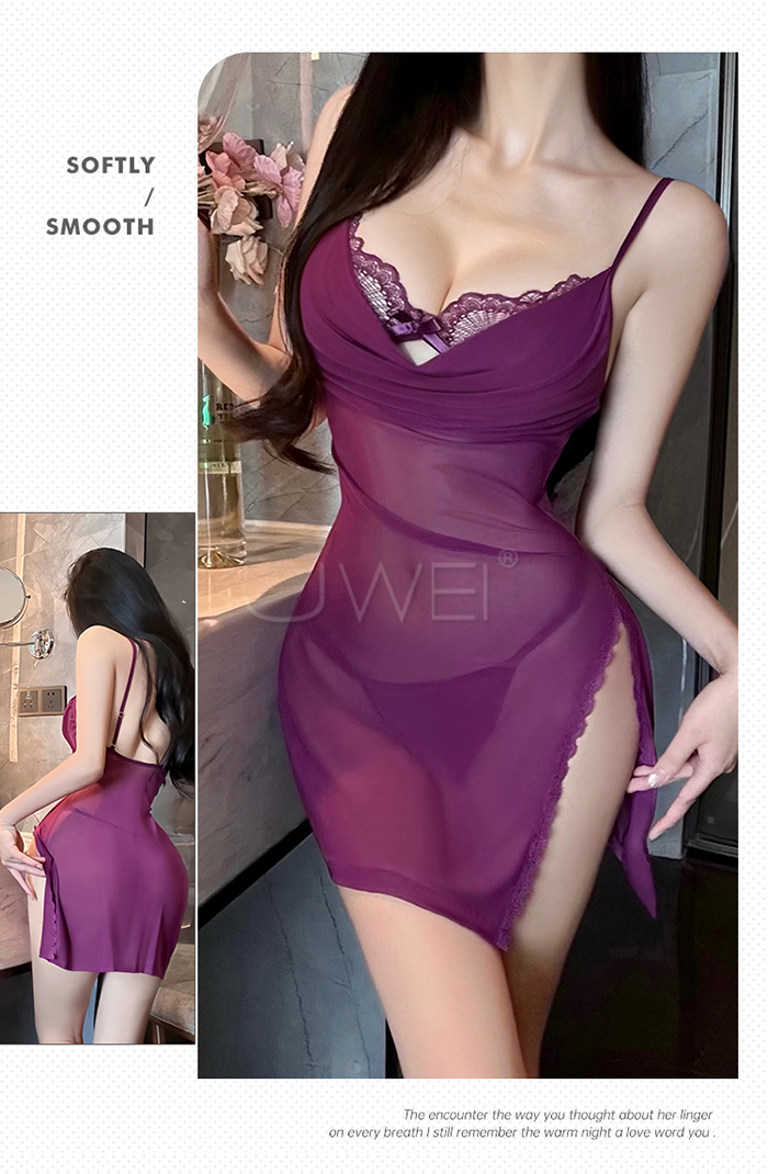►您現在的位置:首頁>月暮迷紗.性感裸紗蕩領透視側開衩細肩帶美背睡裙【睡裙+T褲-紫色】