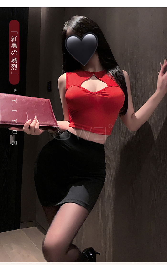 繆斯秘語.胸前挖空露溝貼身包臀超短裙擺秘書裝【T褲+紅上衣+黑裙】