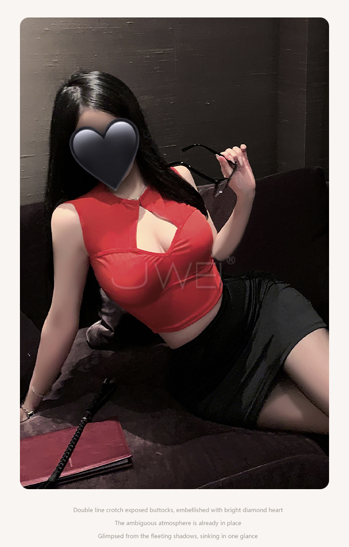 首頁>繆斯秘語.胸前挖空露溝貼身包臀超短裙擺秘書裝【T褲+紅上衣+黑裙】