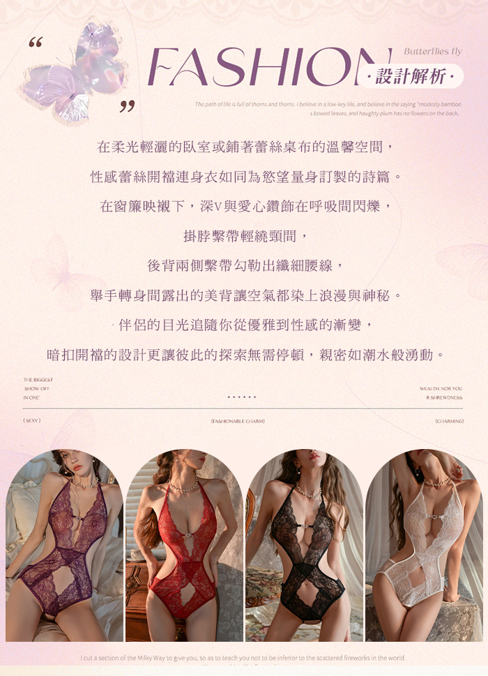 ►您現在的位置:首頁>繁花似錦.深V愛心鑽飾露胸掛脖繫帶美背蕾絲開襠連體衣【黑色】