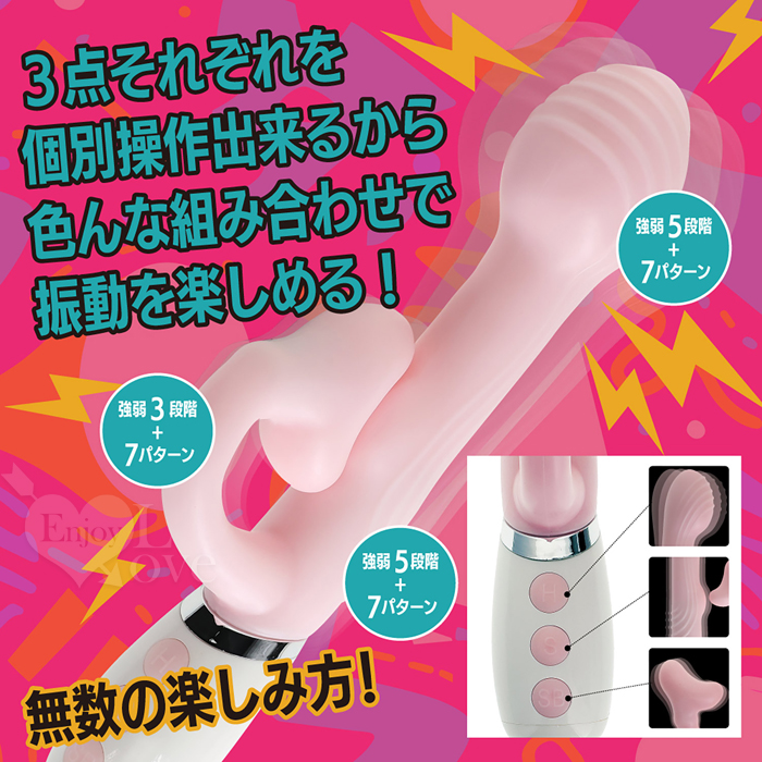 このパワフルな3モーターバイブレーターは、ヘッド、Gスポット、外部刺激をそれぞれ独立してコントロールできます。