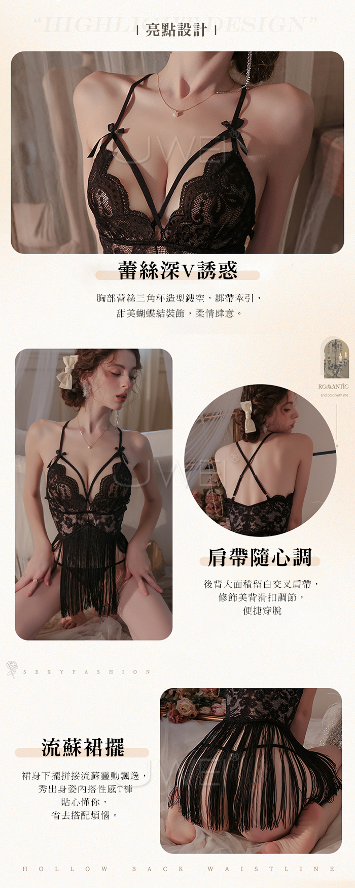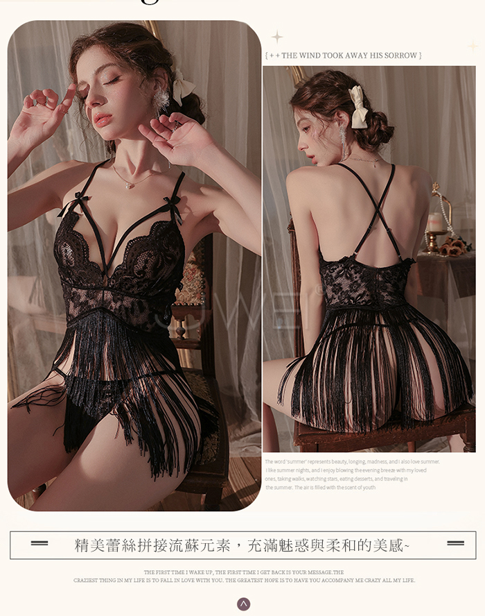 ►您現在的位置:首頁>輕舞搖曳.網眼蕾絲深V誘惑流蘇裙襬露臀睡裙【睡裙+T褲】黑色
