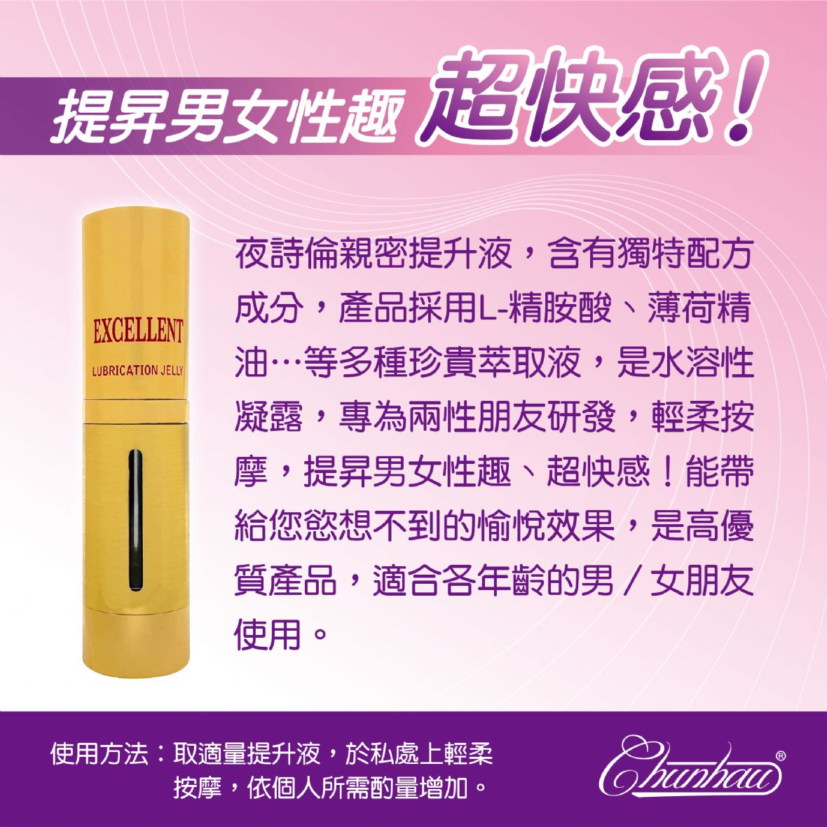 使用方法:取適量提昇液 於私處上輕柔按摩 依個人所需酌量增加